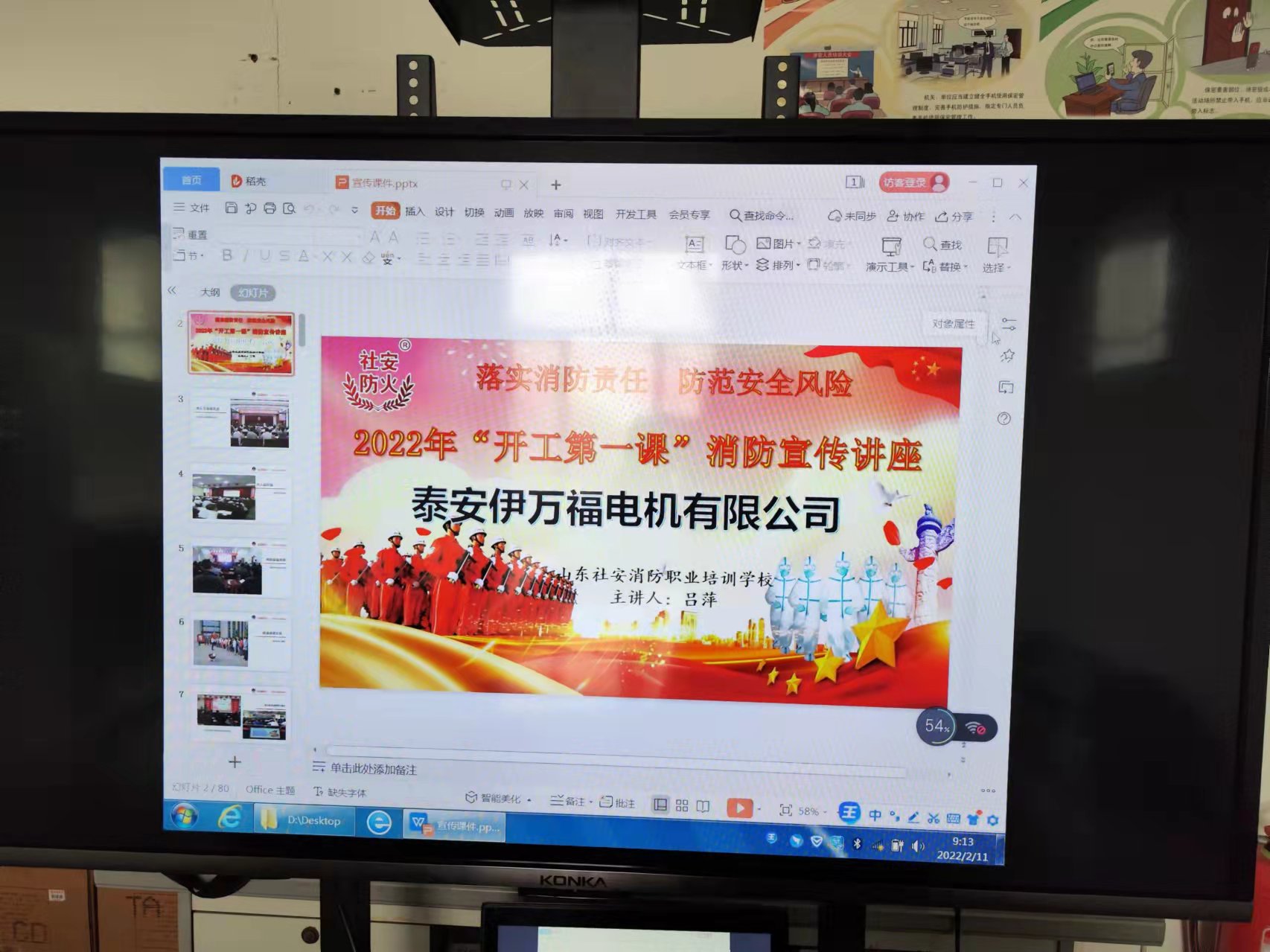 2022年 2月11日,泰安伊萬福發電機公司開展了2022年“開工第一課”消防宣傳講座,山東社安消防職業培訓學校呂老師以生動的方式講敘了多種情況下的火災現場及其滅火方法等,不但掌握了一些消防安全工作的基本理論知識,還給我們的生活習慣帶來了一點提醒。