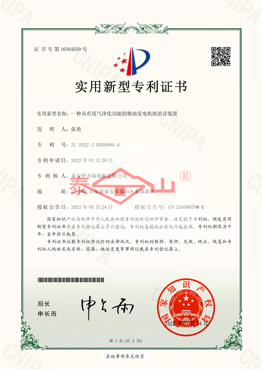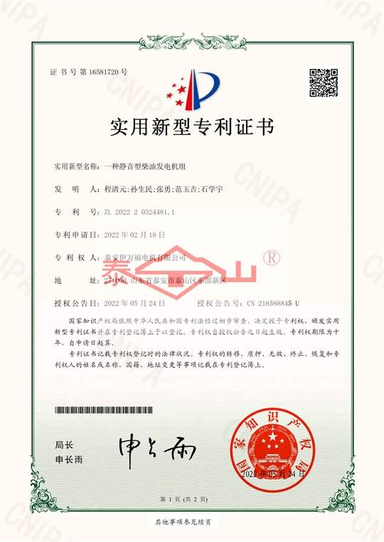 喜報(bào):泰安伊萬福電機(jī)有限公司獲得六項(xiàng)實(shí)用新型專利證書